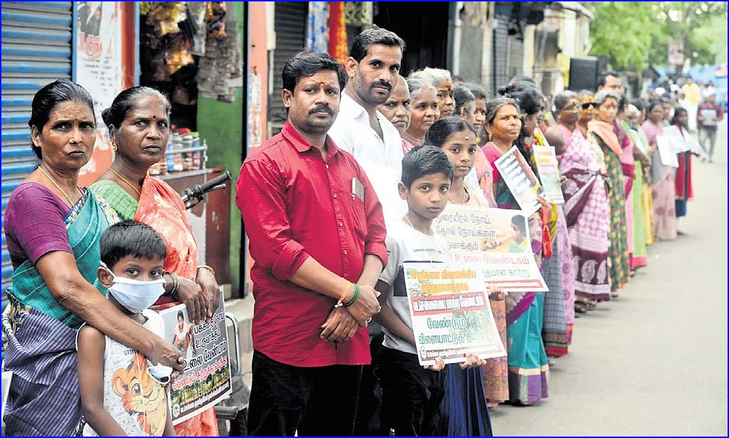 வட சென்னை குடியிருப்போர் நலச்சங்கங்களின் கூட்டமைப்பு சார்பில் மனித சங்கிலி போராட்டம் கொடுங்கையூரில் நடைபெற்றது. கொடுங்கையூர் குப்பை கிடங்கு அருகில் மக்கள் குடியிருக்கும் எழில் நகரில் இருந்து தண்டையார்பேட்டை நெடுஞ்சாலை, கண்ணதாசன் நகர் வழியாக மீனாம்பாள் சாலை, கேப்டன் காட்டன் கால்வாய் பாலம் மற்றும் மகாகவி பாரதி நகர், வியாசர்பாடி டாக்டர் அம்பேத்கர் கல்லூரி வரை, அப்பகுதி குடியிருப்புவாசிகள் நீண்ட வரிசையில், கொடுங்கையூரில் எரிஉலை திட்டம் வேண்டாம் என வலியுறுத்தும் பதாகைகளுடன், முகக்கவசம் அணிந்து மனித சங்கிலி போராட்டத்தில் ஈடுபட்டனர்.