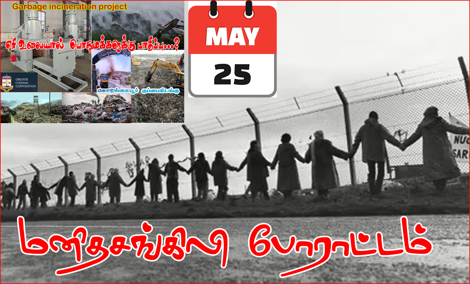 சென்னை: கொடுங்கையூர் குப்பை மேட்டில் எரி உலை அமைக்கும் தமிழ்நாடு அரசு மற்றும் சென்னை மாநகராட்சியின் திட்டத்துக்கு எதிர்ப்பு தெரிவித்து மே 25ந்தேதி மனித சங்கிலி போராட்டம் அறிவிக்கப்பட்டு உள்ளது.
