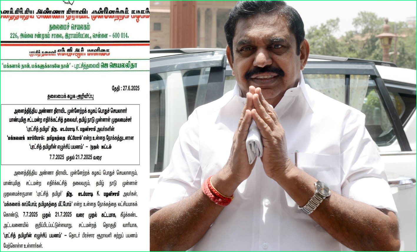 இதுகுறித்து அதிமுக சார்பில் வெளியிடப்பட்டுள்ள அறிக்கையில் கூறப்பட்டுள்ளதாவது, “அனைத்திந்திய அண்ணா திராவிட முன்னேற்றக் கழகப் பொதுச் செயலாளரும், சட்டமன்ற எதிர்க்கட்சித் தலைவரும், தமிழ்நாடு முன்னாள் முதலமைச்சருமான எடப்பாடி பழனிசாமி, ‘மக்களைக் காப்போம்; தமிழகத்தை மீட்போம்’ என்ற உன்னத நோக்கத்தை லட்சியமாகக் , 7.7.2025 – 21.7.2025 வரை முதல் கட்டமாக, கீழ்க்கண்ட அட்டவணையில் குறிப்பிடப்பட்டுள்ளவாறு, சட்டமன்றத் தொகுதி வாரியாக, தொடர் பிரச்சார சூறாவளி சுற்றுப் பயணம் மேற்கொள்ள உள்ளார்.
