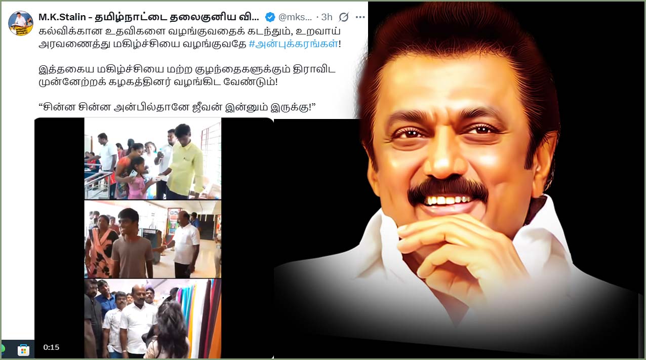 அன்புக்கரங்கள் திட்டத்தின் மூலம் பயணடைந்த மாணவ, மாணவிகளின் வீடியோக்களை பகிர்ந்து தமிழ்நாடு முதலமைச்சர் மு.க.ஸ்டாலின் எக்ஸ் தளத்தில் பதிவு ஒன்றை வெளியிட்டுள்ளார். அந்த பதிவில், “கல்விக்கான உதவிகளை வழங்குவதைக் கடந்தும், உறவாய் அரவணைத்து மகிழ்ச்சியை வழங்குவதே அன்புக்கரங்கள்!