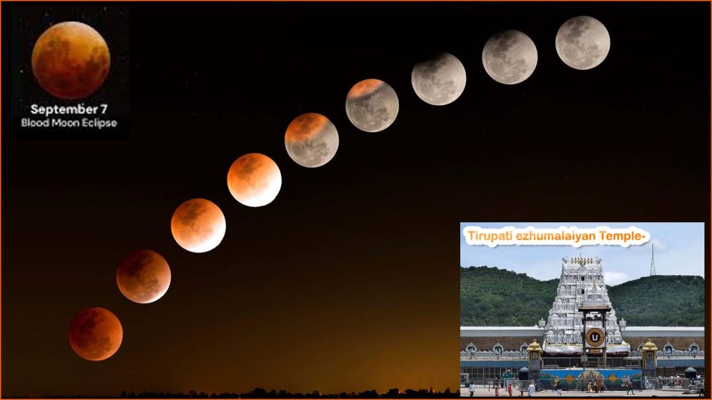 சந்திர கிரகணத்தையொட்டி,  திருப்பதி ஏழுமலையான் கோயில் நடை அடைக்கப்படும் என அறிவிக்கப்பட்டு உள்ளது.  திருப்பதி ஏழுமலையான் கோவிலில் கிரகண காலங்களில் மூடப்படுவது வழக்கம். அதன்படி அடுத்த மாதம் (செப்டம்பர்) 7-ந்தேதி (ஞாயிற்றுக்கிழமை) இரவு 9.50 மணிக்கு சந்திர கிரகணம் ஆரம்பித்து, மறுநாள் (திங்கட்கிழமை) அதிகாலை 1.31 மணிக்கு நிறைவடைகிறது.