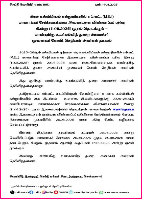 2025-26ஆம் கல்வியாண்டிற்கான அரசு கல்வியியல் கல்லூரிகளில் எம்.எட் (M.Ed.) மாணாக்கர் சேர்க்கைகான இணையதள விண்ணப்பப் பதிவு இன்று (11.08.2025) முதல் 20.08.2025 வரை நடைபெறவுள்ளதாக உயர்கல்வித் துறை அமைச்சர் முனைவர் கோவி. செழியன் தெரிவித்துள்ளார்.