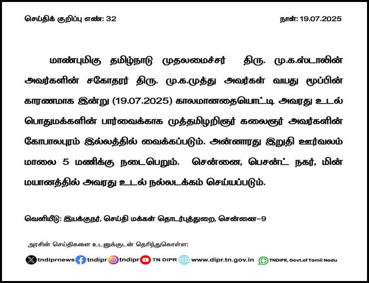 இதையடுத்து, மு.க.முத்து இறுதி ஊர்வலம் மாலை 5 மணிக்கு நடைபெறும் என்று அறிவிக்கப்பட்டு உள்ளது.  சென்னை, பெசன்ட் நகர், மின் மயானத்தில் அவரது உடல் நல்லடக்கம் செய்யப்படும் என அவரது குடும்பத்தினர் தரப்பில் தெரிவிக்கப்பட்டுள்ளது.
