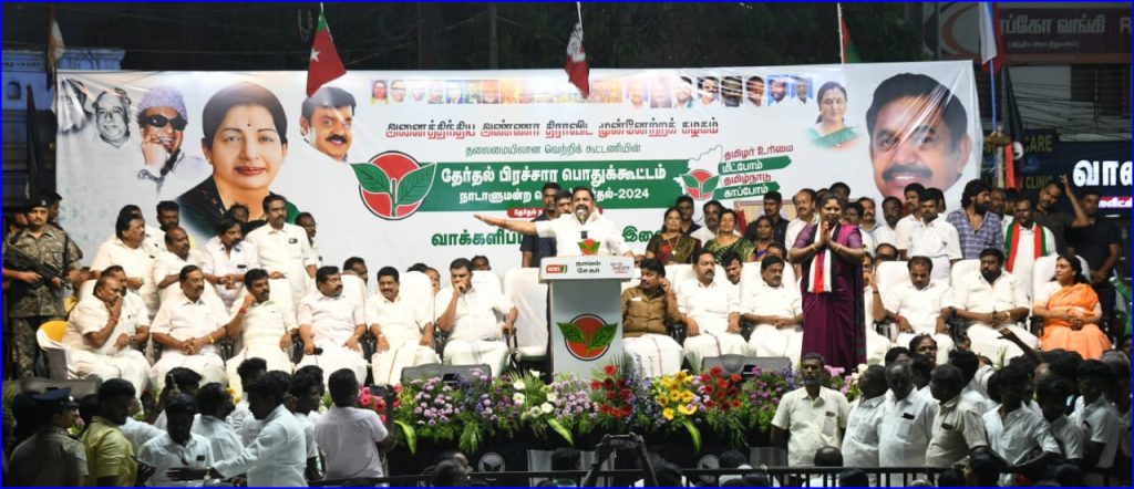 தமிழ்நாட்டில் நாடாளுமன்ற தேர்தலையொட்டி, தேர்தல் பிரசாரம் சூடுபிடிக்கத் தொடங்கி உள்ளது. திமுக கூட்டணி வேட்பாளர்களை ஆதரித்த முதலமைச்சரும், திமுக தலைவருமான மு.க.ஸ்டாலின் பிரசாரம் மேற்கொண்டு வரும் நிலையில், அதிமுக கூட்டணி சார்பில், எடப்பாடி பழனிச்சாமியும் தீவிர வாக்குவேட்டையில் ஈடுபட்டு வருகிறார். நேற்று தூத்துக்குடி மாவட்டத்தில் காலை மு.க.ஸ்டாலின் பிரசாரம் மேற்கொண்ட நிலையில், மாலை அதிமுக சார்பில் எடப்பாடி பழனிச்சாமி தேர்தல் பிரசாரம் மேற்கொண்டார். அங்கு நடைபெற்ற அதிமுக பொதுக்கூட்டத்தில், அதிமுக மற்றும் கூட்டணி கட்சி வேட்பாளர்களை ஆதரித்து வாக்கு சேகரித்த எடப்பாடி பழனிச்சாமி பின்னர் நெல்லை சென்று அதிமுக வேட்பாளர்களுக்கு ஆதரவு கோரினார்.