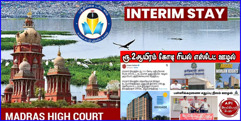 இந்த நிலையில், ராம்சார் நிலத்தில் திமுகஅரசு கட்டிடம் கட்ட அனுமதி கொடுத்ததை எதிர்த்து அறப்போர் இயக்கம் தொடர்ந்த வழக்கை விசாரித்த உயர்நீதிமன்றம், பள்ளிக்கரனை சதுப்பு நிலத்தில் குடியிருப்பு வளாகம் கட்ட அனுமதி வழங்கியது எப்படி, என கேள்வி எழுப்பியதுடன், உச்சநீதிமன்றம், பசுமை தீர்ப்பாய உத்தரவுகள் குறித்து அறியாமல், சென்னை பெருநகர வளர்ச்சி குழுமம் அனுமதி வழங்கிய எப்படி என அடுக்கடுக்கான கேள்விகளை எழுப்பியதுடன், பிரிகேட் நிறுவனம் பள்ளிக்கரனை சதுப்பு நிலப்பகுதியில் சிஎம்டிஏ எப்படி 1400 குடியிருப்புகள் கட்ட அனுமதி வழங்கியது, இது சட்டவிரோதமானது என்ற கூறியதுடன், பிரிகேட் நிறுவனம், இந்த பகுதியில் குடியிருப்பு கட்டும் கட்டுமான பணிகளை மேற்கெள்ளக்கூடாது என இடைக்கால தடை விதித்து உத்தரவிட்டுள்ளது.