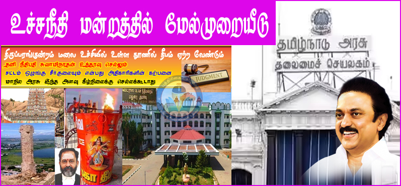 மதுரை திருப்பரங்குன்றத்தில் உள்ள சிக்கந்தர் தர்கா அருகே உள்ள ஒரு கல் தூணில் விளக்கேற்ற அனுமதி வழங்கிய சென்னை உயர் நீதிமன்றத்தின் உத்தரவை எதிர்த்து உச்ச நீதிமன்றத்தை நாடப்போவதாக தமிழக அரசு அறிவித்தது.