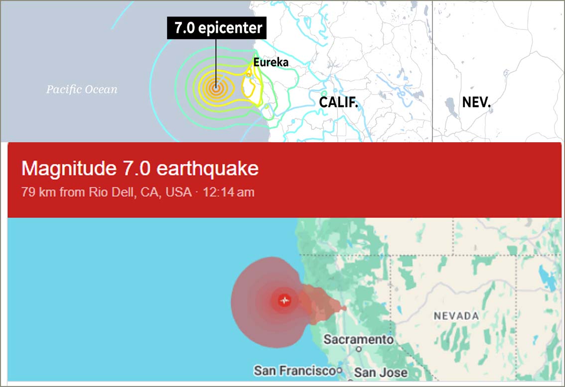 கலிபோர்னியாவின் மக்கள்தொகை குறைவாக உள்ள வடக்கு கடற்கரையில் மென்டோசினோ டிரிபிள் ஜங்ஷன் எனப்படும் நில அதிர்வு சிக்கலான பகுதியில் நிலநடுக்கம் ஏற்பட்டது. இங்குதான் மூன்று டெக்டோனிக் தட்டுகள் சந்திக்கின்றன மற்றும் வடமேற்கின் காஸ்காடியா துணை மண்டலம் மற்றும் கலிபோர்னியாவின் சான் ஆண்ட்ரியாஸ் ஃபால்ட் அமைப்பு சந்திக்கின்றன. இந்த நிலநடுக்கம் மென்டோசினோ தவறு மண்டலத்தில் ஏற்பட்டது.
