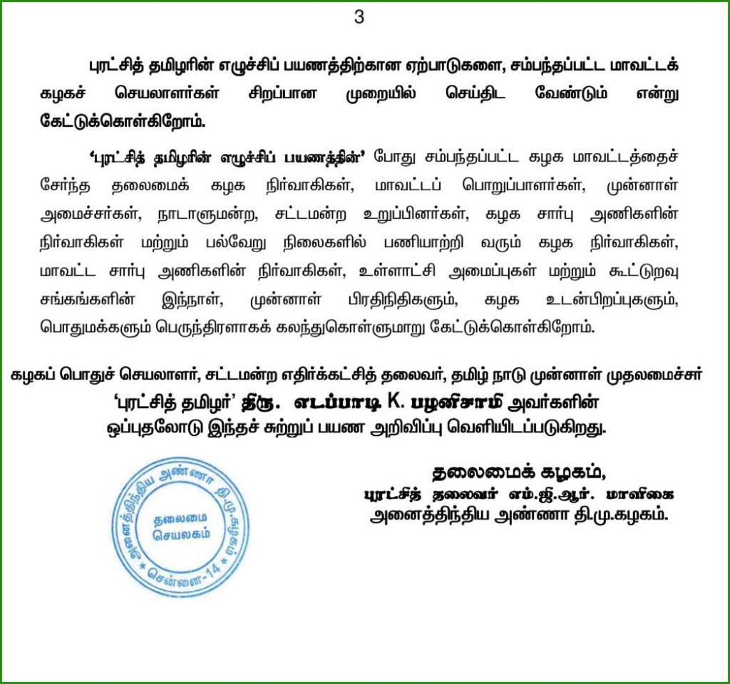 இதுகுறித்து அதிமுக தலைமை வெளியிட்டுள்ள அறிக்கையில் , அனைத்திந்திய அண்ணா திராவிட முன்னேற்றக் கழகப் பொதுச் செயலாளர் எடப்பாடி K பழனிசாமி அவர்கள், ‘மக்களைக் காப்போம் தமிழகத்தை மீட்போம்’ என்ற உன்னத நோக்கத்தை லட்சியமாகக் கொண்டு 11.8.2025 முதல் 23.8.2025 வரை மூன்றாம் கட்டமாக, கீழ்க்கண்ட அட்டவணையில் குறிப்பிடப்பட்டுள்ளவாறு சட்டமன்றத் தொகுதி வாரியாக, புரட்சித் தமிழரின் எழுச்சிப் பயணம் தொடர் பிரச்சார் சூராவளி சுற்றுப் பயணம் மேற்கொள்ள உள்ளார்.