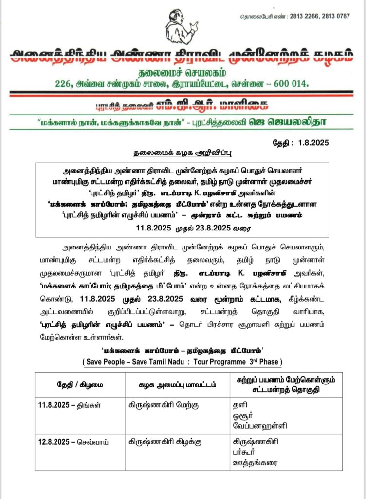 இதுகுறித்து அதிமுக தலைமை வெளியிட்டுள்ள அறிக்கையில் , அனைத்திந்திய அண்ணா திராவிட முன்னேற்றக் கழகப் பொதுச் செயலாளர் எடப்பாடி K பழனிசாமி அவர்கள், ‘மக்களைக் காப்போம் தமிழகத்தை மீட்போம்’ என்ற உன்னத நோக்கத்தை லட்சியமாகக் கொண்டு 11.8.2025 முதல் 23.8.2025 வரை மூன்றாம் கட்டமாக, கீழ்க்கண்ட அட்டவணையில் குறிப்பிடப்பட்டுள்ளவாறு சட்டமன்றத் தொகுதி வாரியாக, புரட்சித் தமிழரின் எழுச்சிப் பயணம் தொடர் பிரச்சார் சூராவளி சுற்றுப் பயணம் மேற்கொள்ள உள்ளார்.