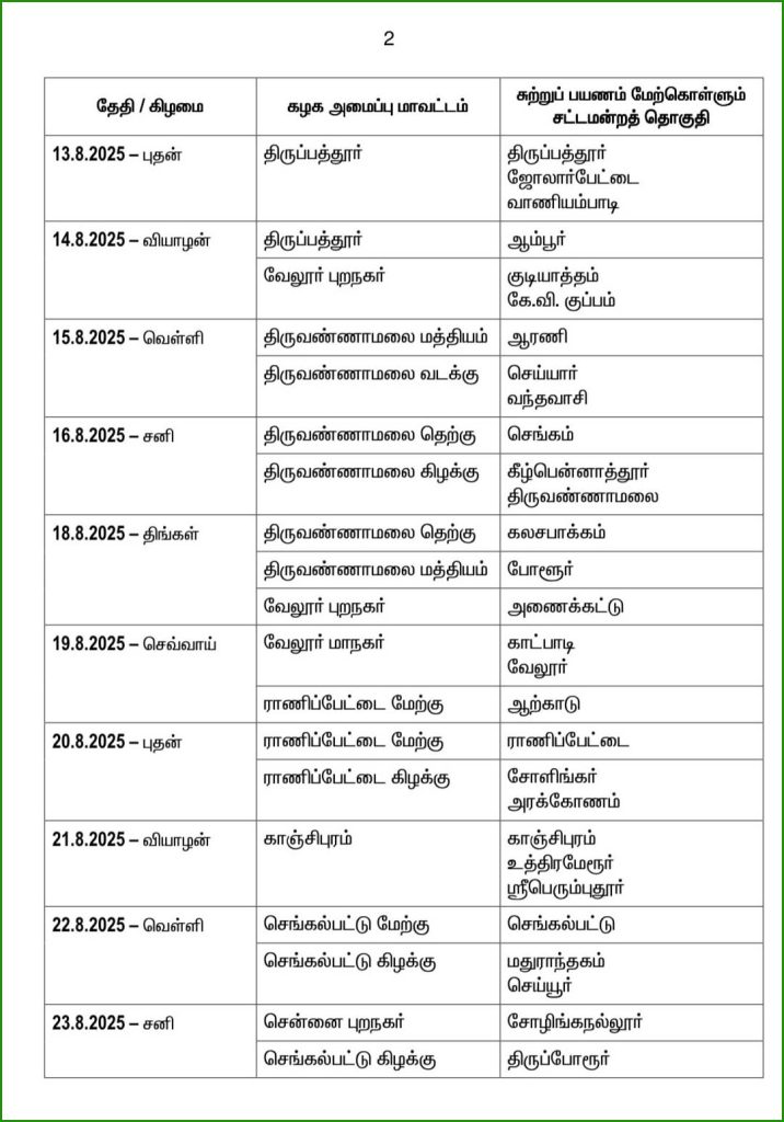 அதன்படி, 11.8.2025- கிருஷ்ணகிரி மேற்கு, 12.8.2025- கிருஷ்ணகிரி கிழக்கு, 13.8.2025- திருப்பத்தூர், 14.8.2025- திருப்பத்தூர், வேலூர் புறநகர், 15.8.2025- திருவண்ணாமலை மத்தியம், திருவண்ணாமலை வடக்கு, 16.8.2025- திருவண்ணாமலை தெற்கு, திருவண்ணாமலை கிழக்கு, 18.8.2025- திருவண்ணாமலை தெற்கு, திருவண்ணாமலை மத்தியம், வேலூர் புறநகர், 19.8.2025-, வேலூர் மாநகர், 20.8.2025-ராணிப்பேட்டை மேற்கு, ராணிப்பேட்டை மேற்கு, ராணிப்பேட்டை கிழக்கு, 21.8.2025- காஞ்சிபுரம், 22.8.2025- செங்கல்பட்டு மேற்கு, செங்கல்பட்டு கிழக்கு, 23.8.2025- சென்னை புறநகர், செங்கல்பட்டு கிழக்கு.