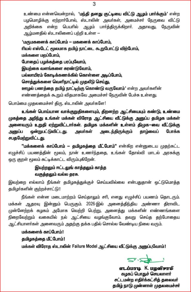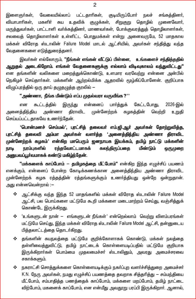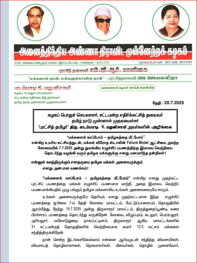 இந்த நிலையில், “மக்களைக் காப்போம் – தமிழகத்தை மீட்போம்” என்கிற உயரிய லட்சியத்துடன், மக்கள் விரோத ஸ்டாலின் Failure Model ஆட்சியை அகற்ற கோவையில் 7.7.2025 அன்று துவங்கிய எழுச்சிப் பயணத்திற்கு இமாலய வெற்றியை தொடர்ந்து வழங்கி வரும் தமிழக மக்களுக்கு எனது மனமார்ந்த நன்றிகள்.