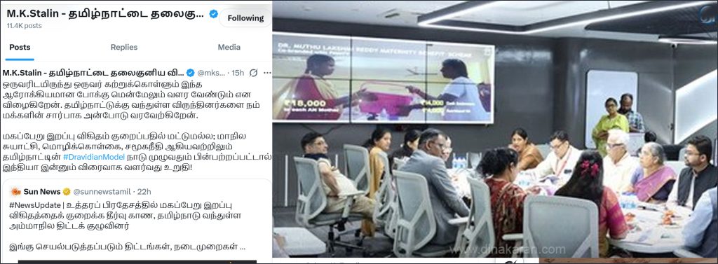 இந்த நிலையில், மகப்பேறின்போது ஏற்படும் மரணங்களை குறைக்க திராவிட மாடலை உத்தரப் பிரதேச மாடல் பின்பற்ற உள்ளது. உத்தரப்பிரதேச மாநிலத்தில் ஒரு லட்சம் பிறப்புக்கு உயிரிழப்புகள் 140ஆக உள்ளன. இதன் எதிரொலியாக மகப்பேறு மரணங்களை குறைக்க தமிழ்நாடு செயல்படுத்தும் திட்டங்கள் குறித்து உ.பி. அதிகாரிகள் குழு தமிழகத்திற்கு நேரில் வந்து பார்வையிட்டது. தமிழ்நாட்டில் ஆரம்ப சுகாதார நிலையங்கள், மருத்துவமனைகளை உத்தரப்பிரதேச அதிகாரிகள் பார்வையிட்டனர். மதுரை, விருதுநகர் மாவட்டங்களில் மருத்துவமனைகளை உ.பி. அதிகாரிகள் குழு பார்வையிட்டு, இங்கு செயல்படுத்தப்படும் திட்டங்கள், நடைமுறைகள் குறித்து அதிகாரிகளிடம் விரிவாக கேட்டறிந்தது.