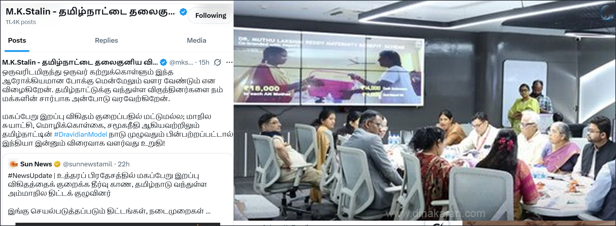 சென்னை: தமிழ்நாட்டில், மகப்பேறு இறப்பு விகிதத்தை குறைப்பதற்கான தீர்வுகளைக் கண்டறிய தமிழ்நாடு வந்துள்ள உத்திரபிரேதச அதிகாரிகள் குழுவை வரவேற்பதாக தமிழ் நாடு முதலமைச்சர் ஸ்டாலின் தெரிவித்துள்ளர்.