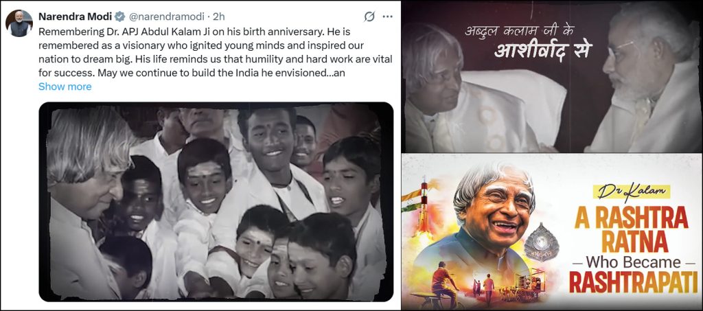 டெல்லி: அப்துல் கலாம் கனவு கண்ட இந்தியாவை கட்டியெழுப்புவோம், என பிரதமர் மோடி, மறைந்த குடியரசு தலைவர் அப்துல் கலாம் பிறந்தநாளை முன்னிட்டு, தனது எக்ஸ் தளத்தில் பதிவிட்டுள்ளார். அத்துடன் அப்துல் கலாமுடன் தனது நெருக்கமான உறவு குறித்த வீடியோவையும் பகிர்ந்துள்ளார்.