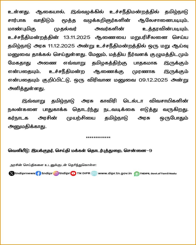 தமிழக அரசு காவிரி டெல்டா விவசாயிகளின் நலன்களை பாதுகாக்க தொடர்ந்து நடவடிக்கை எடுத்து வருவதாகவும், கர்நாடக அரசின் முயற்சியை தமிழக அரசு ஒருபோதும் அனுமதிக்காது என்றும் துரைமுருகன் தெரிவித்துள்ளார்.