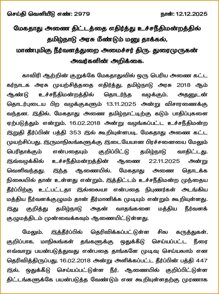 மேகதாது அணை திட்டத்தை எதிர்த்து உச்சநீதிமன்றத்தில் தமிழக அரசு மீண்டும் மனு தாக்கல் செய்துள்ளது. இது குறித்து நீர்வளத்துறை அமைச்சர் துரைமுருகன் வெளியிட்டுள்ள அறிக்கையில், மேகதாது அணை எவ்வாறு தமிழகத்திற்கு பாதகமாக இருக்கும் என்பதை விளக்கி மத்திய நீர்வளக் குழுமத்திடம் மனு அளிக்கப்பட்டுள்ளதாக கூறியுள்ளார்.