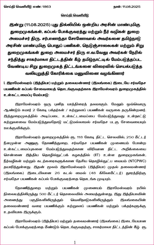 I. இராமேஸ்வரம் (இந்தியா) மற்றும் தலைமன்னார் (இலங்கை) இடையே சர்வதேச பயணிகள் கப்பல் சேவையைத் தொடங்குவதற்காக இராமேஸ்வரம் துறைமுகத்தில் உள்கட்டமைப்பு மேம்பாடு: