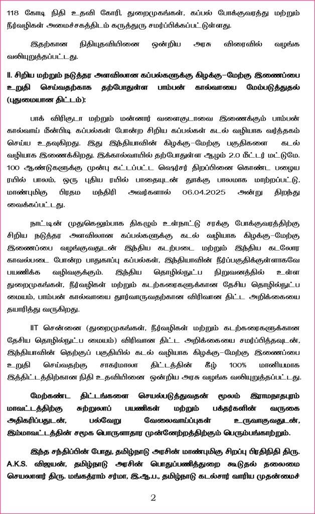 இராமேஸ்வரம் (இந்தியா) மற்றும் தலைமன்னார் (இலங்கை) இடையேயான கப்பல் போக்குவரத்தை மீண்டும் தொடங்குவதற்கு, சாகர்மாலா திட்டத்தின் கீழ் ரூ. 118 கோடி நிதி உதவி கோரி, துறைமுகங்கள், கப்பல் போக்குவரத்து மற்றும் நீர்வழிகள் அமைச்சகத்திடம் கருத்துரு சமர்ப்பிக்கப்பட்டுள்ளது. இதற்கான நிதியுதவியினை ஒன்றிய அரசு விரைவில் வழங்க வலியுறுத்தப்பட்டது.