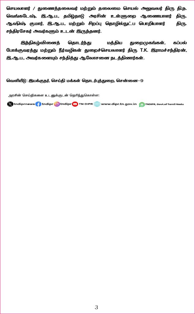 மத்திய அரசின் துறைமுகங்கள், கப்பல் போக்குவரத்து மற்றும் நீர் வழிகள் துறை அமைச்சர் சர்பானாந்தா சோனோவாலை  தமிழ்நாடு அரசின் அமைச்சர் எ.வ.வேலு அவர்கள் நேரில் சந்தித்து சாகர்மாலா திட்டத்தின் கீழ் தமிழ்நாட்டில் மேம்படுத்தப்பட வேண்டிய சிறு துறைமுகத் திட்டங்களை விரைவில் செயல்படுத்த வலியுறுத்தி கோரிக்கை மனுவினை வழங்கினார். அந்த மனுவில் இடம்பெற்றுள்ள விவரங்கள் வருமாறு:-