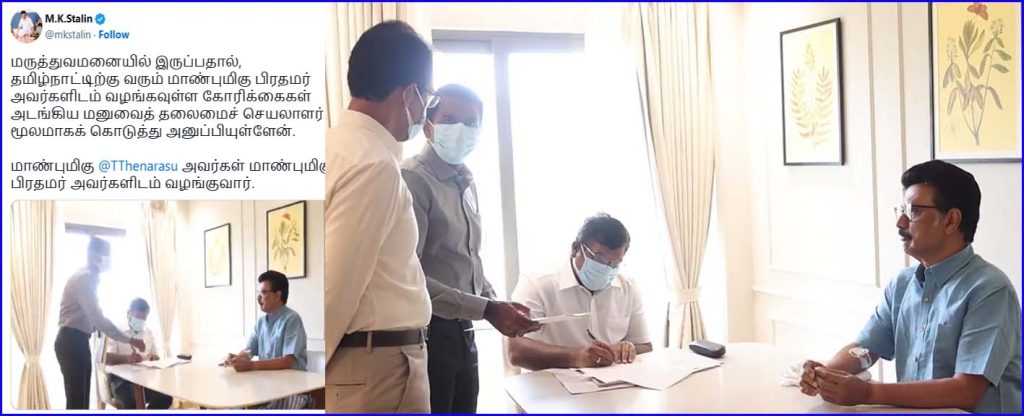 மருத்துவமனையில் இருப்பதால், தமிழ்நாட்டிற்கு வரும் பிரதமரிடம் வழங்கவுள்ள கோரிக்கைகள் அடங்கிய மனுவைத் தலைமைச் செயலாளர் மூலமாக முதல்வர் கொடுத்து அனுப்பியுள்ளார். தலைமைச் செயலாளிடம் இருந்து அமைச்சர் தங்கம் தென்னரசு பெற்றுக்கொண்டு, அதை பிரதமர் மோடியிடம் வழங்குவார் என்று முதல்வர் ஸ்டாலின் தன்னுடைய சமூக வலை தளப் பதிவின் மூலம் தெரிவித்துள்ளார்.