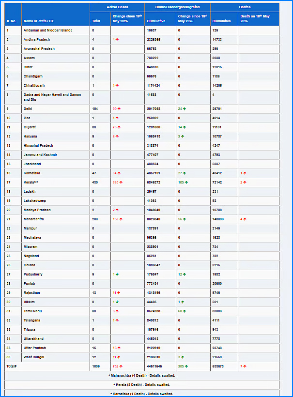 இந்த நிலையில் இன்று (மே 26) காலை 8 மணி நிலவரப்படி கரோனா பாதிப்பு விவரங்களை மத்திய சுகாதாரத் துறை வெளியிட்டுள்ளது. அதன்படி நாட்டில் தற்போது 1,009 பேருக்கு கரோனா உறுதி செய்யப்பட்டுள்ளது. அதிகபட்சமாக கேரளத்தில் 430 பேருக்கு உறுதியாகியுள்ளது. தொடர்ந்து மகாராஷ்டிரத்தில் 209 பேர், டில்லியில் 104, குஜராத்தில் 83, தமிழ்நாட்டில் 69, கர்நாடகத்தில் 47 , உத்தரப் பிரதேசத்தில் 15, ராஜஸ்தானில் 13, மேற்கு வங்கத்தில் 12, ஹரியாணா, புதுச்சேரியில் தலா 9, ஆந்திரத்தில் 4, மத்தியப் பிரதேசத்தில் 2, சத்தீஸ்கர், கோவா, தெலங்கானாவில் தலா ஒருவர் என மொத்தம் 1,009 பேர் கரோனாவுக்கு சிகிச்சை பெற்று வருகின்றனர்.