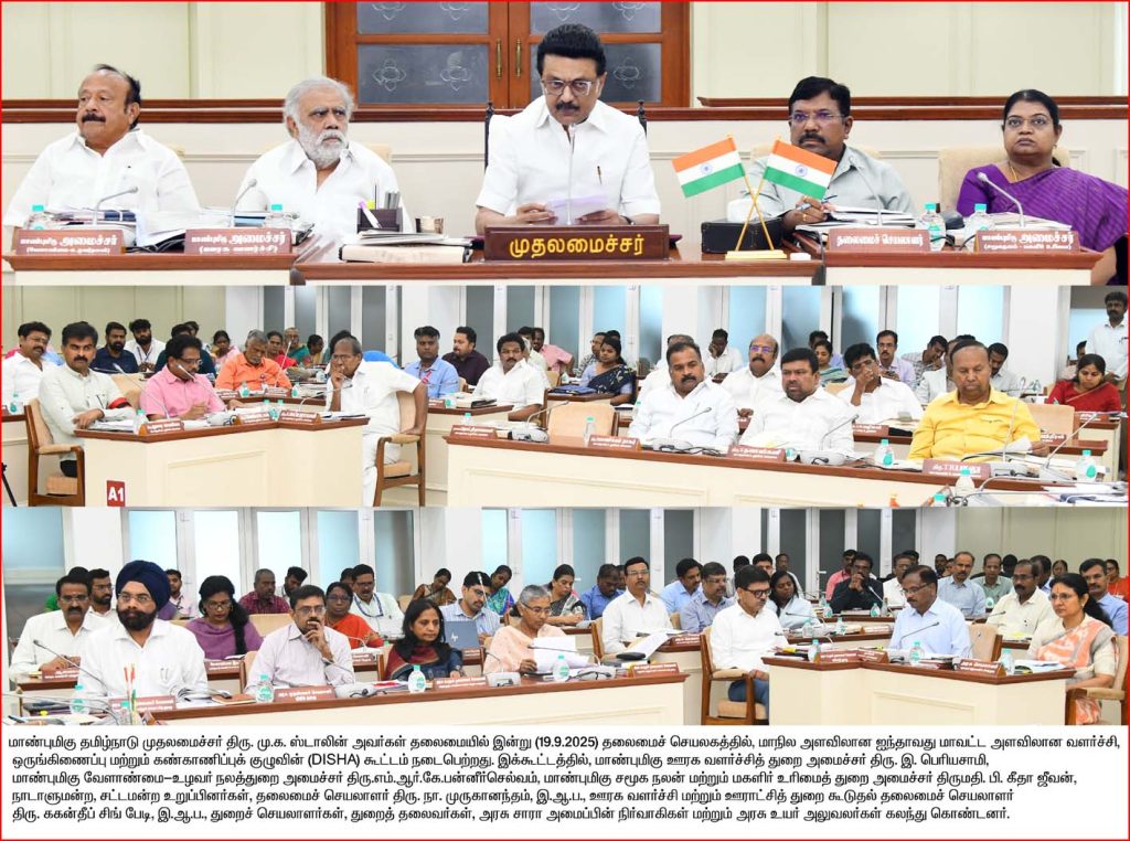 இதுதொடர்பாக தமிழ்நாடு அரசு வெளியிட்டுள்ள அரசின் செய்திக்குறிப்பில் , சென்னை தலைமைச் செயலகத்தில் நேற்று (செப் 19) முதல்வர் மு.க.ஸ்டாலின் தலைமையில், மாநில அளவிலான வளர்ச்சி, ஒருங்கிணைப்பு மற்றும் கண்காணிப்புக் (திஷா) குழுவின் ஐந்தாவது ஆய்வுக் கூட்டம் நடைபெற்றது. இந்தக் கூட்டத்தில் முதல்வர் ஸ்டாலின் பேசியது: “தமிழகத்தில் மத்திய அரசின் திட்டங்களை செயல்படுத்துவதை கவனமுடன் கண்காணித்து வளர்ச்சித் திட்டங்களை நிறைவேற்றுவதில் அக்கறையோடு அரசு செயல்பட்டு வருகிறது.