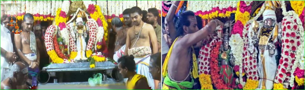 முருக பெருமான் வள்ளி தாயாரை கடத்திச் சென்று, திருத்தணி மலைமீது வைத்து திருமணம் செய்து கொண்டதாக உள்ள ஐதீகத்தின் அடிப்படையில், குதிரை வாகனத்தில் புறப்பட்ட முருக பெருமான், வள்ளி தயாருடன் கோயிலில் உள்ள வள்ளி மண்டபம் சென்றடைந்தார். பின்னர் வேதாச்சாரியார்கள் மந்திரங்கள் முழங்க பக்தர்கள் முன்னிலையில் திருக்கல்யாண வைபவம் நடைபெற்றது.