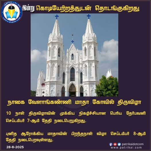 வேளாங்கண்ணி மாதா கோவில் திருவிழா  ஆகஸ்ட் 29ஆம் தேதி முதல் செப்டம்பர் 8ஆம் தேதி வரை திருவிழா நடைபெறும்.