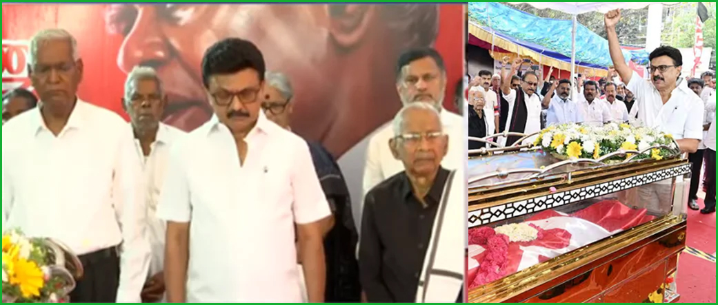 அப்போது, தகைசால் தமிழர் நல்லகண்ணு உடல் அருகே நின்று, தகைசால் தமிழருக்கு வீர வணக்கம், செவ்வணக்கம் என்று முதலமைச்சர் மு.க. ஸ்டாலின் முழக்கமிட்டார்.