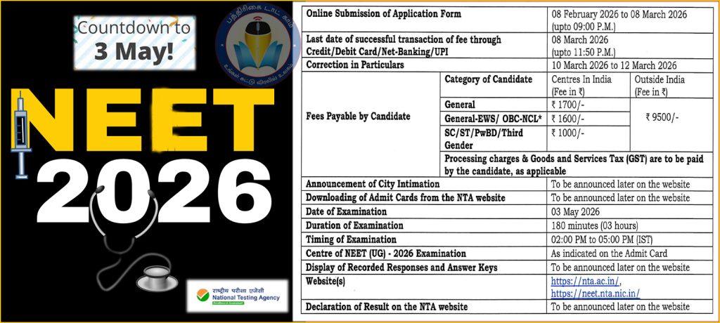 இந்தியாவின் அரசு மற்றும் தனியார் மருத்துவக் கல்லூரிகளில் உள்ள மருத்துவ பட்டப்படிப்பு (MBBS, BDS), கால்நடை மருத்துவம் மற்றும் விலங்கு பராமரிப்பு (BVSc & AH), ஆயுர்வேதம், யூனானி, சித்த மருத்துவம், ஹோமியோபதி, ஆயுதப்படை மருத்துவ சேவைகள், நர்சிங் படிப்பு ஆகிய மருத்துவ படிப்புகளுக்கு ஒரே நுழைவு தேர்வாக நீட் தேர்வு மூலமாக மாணவர்கள் சேர்க்க நடத்தப்பட்டு வருகிறது. அந்த வகையில், 2026-27ஆம் கல்வியாண்டிற்கான நீட் தேர்வு தொடர்பான தகவல்கள் வெளியாகியுள்ளது.