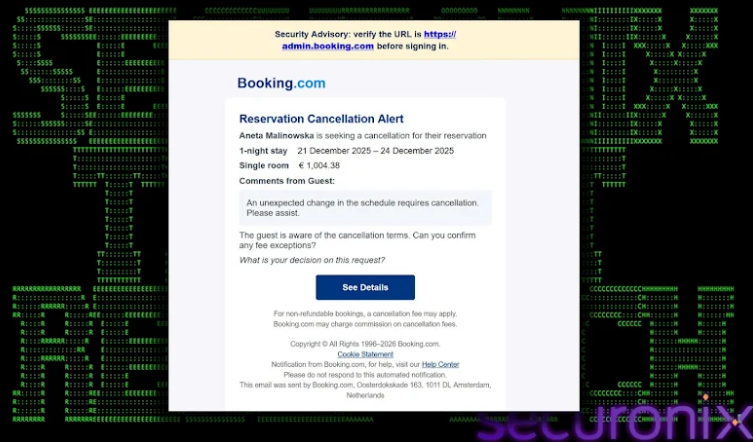 இதற்கிடையில், உண்மையான Booking.com நிர்வாக இணையப்பக்கம் தானாக திறக்கப்பட்டு, பயனர் சந்தேகம் கொள்ளாமல் இருக்க கவனத்தை திருப்புகிறது.