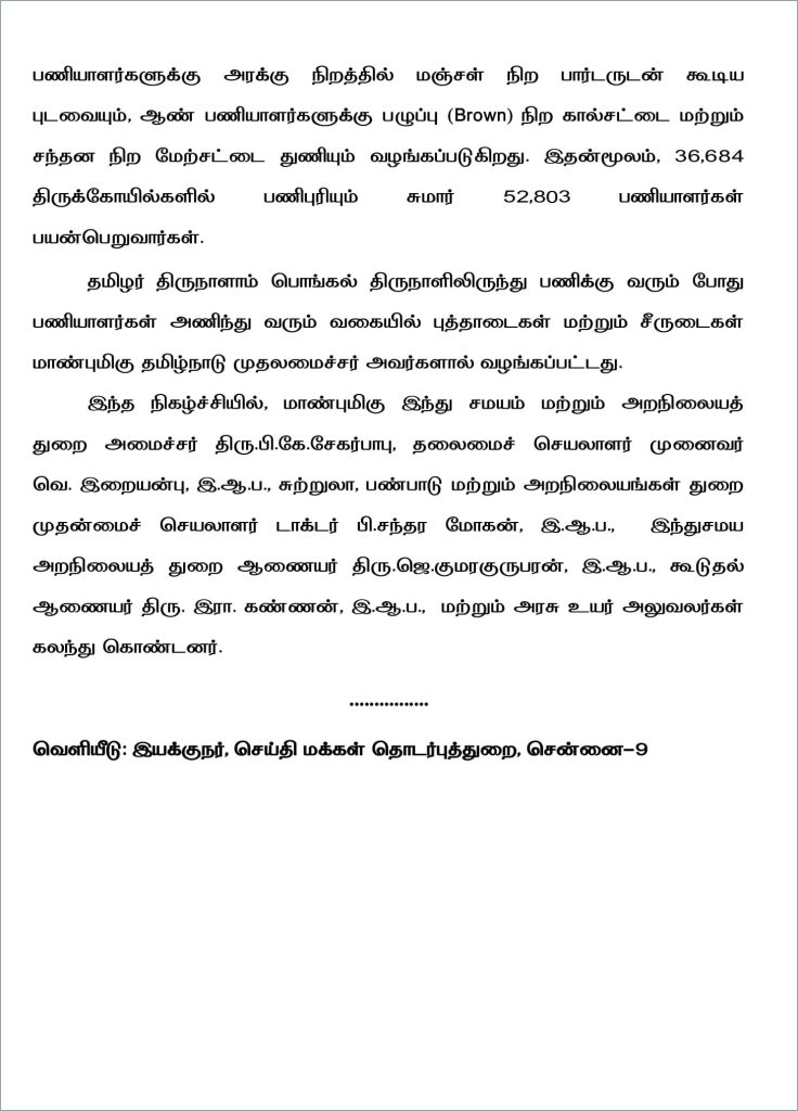 தமிழர் திருநாளாம் பொங்கல் திருநாளிலிருந்து பணிக்கு வரும் போது பணியாளர்கள் அணிந்து வரும் வகையில் புத்தாடைகள் மற்றும் சீருடைகள் முதல்வர் ஸ்டாலின் வழங்கினார். இந்த நிகழ்ச்சியில், இந்து சமயம் மற்றும் அறநிலையத்துறை அமைச்சர் சேகர் பாபு, தலைமைச் செயலாளர் முனைவர் இறையன்பு மற்றும் அரசு உயர் அதிகார்கள் பலர் கலந்துகொண்டனர்.