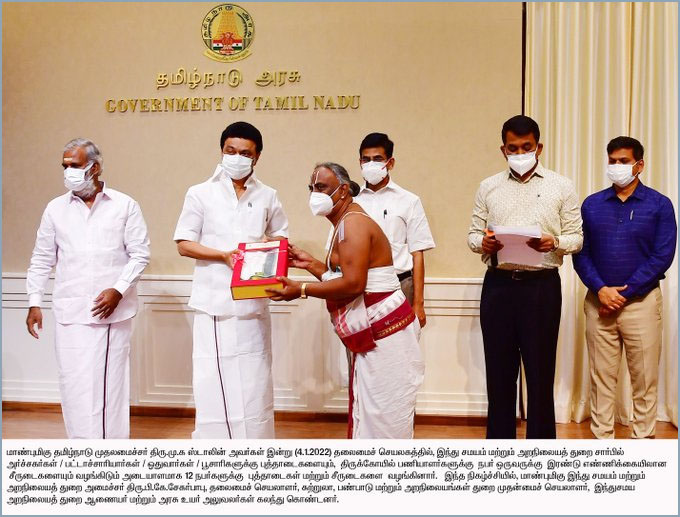 இதுகுறித்து தமிழக அரசு இன்று வெளியிட்டுள்ள செய்திக்குறிப்பில், “முதல்வர் ஸ்டாலின் இன்று (4.1.2022) தலைமைச் செயலகத்தில், இந்து சமயம் மற்றும் அறநிலையத்துறை சார்பில் அர்ச்சகர்கள், பட்டாச்சாரியார்கள், ஓதுவார்கள், பூசாரிகளுக்குப் புத்தாடைகளையும், கோயில் பணியாளர்கள் நபர் ஒருவருக்கு இரண்டு எண்ணிக்கையிலான சீருடைகளையும் வழங்கும் பணிக்கு அடையாளமாக 12 நபர்களுக்கு புத்தாடைகள் மற்றும் சீருடைகளை வழங்கித் தொடங்கி வைத்தார்.