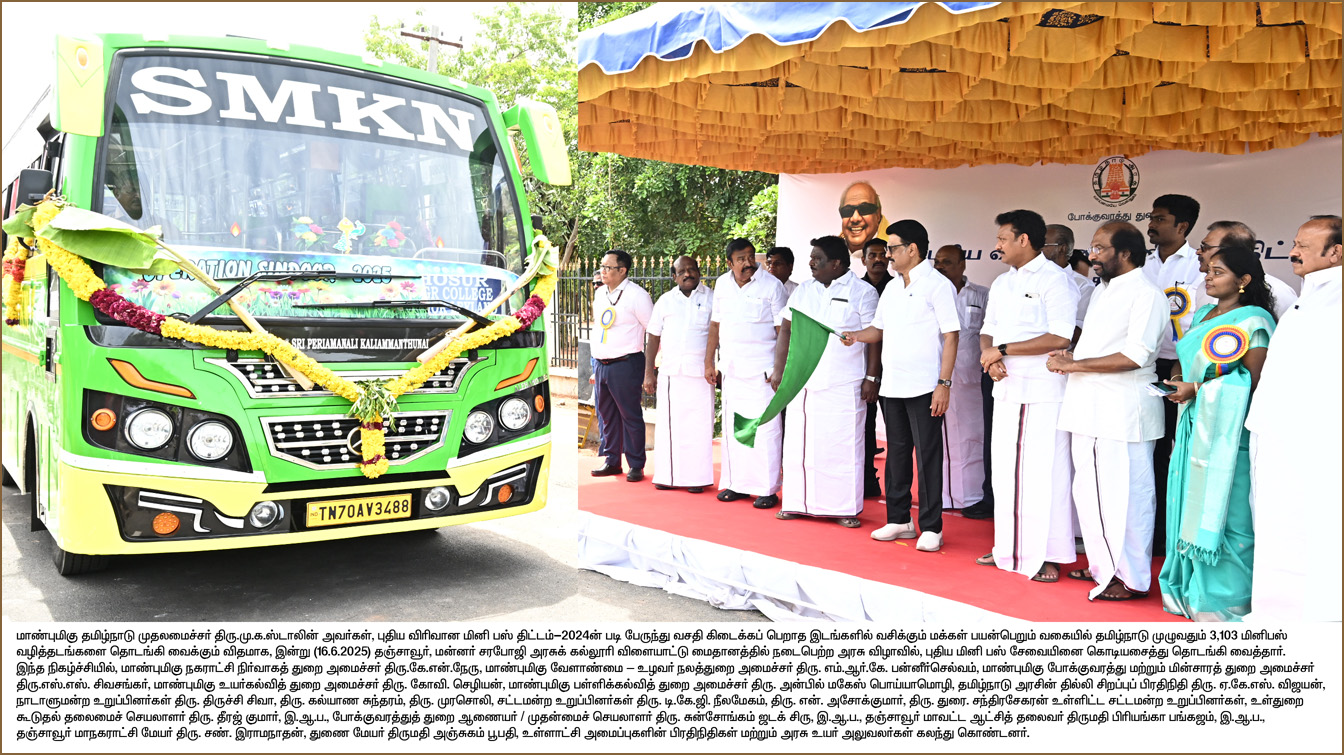கிராமங்கள் உள்பட பேருந்து வசதி கிடைக்கப்பெறாத இடங்களில் வசிக்கும் மக்கள் பயன்பெறும் வகையில் புதிய விரிவான மினிபஸ் திட்டம்- 2024ன் படி புதிய மினி பஸ் சேவையினை முதலமைச்சர் மு.க.ஸ்டாலின் தொடங்கி வைத்தார். அதன்படி, தமிழ்நாட்டில் பேருந்து இயக்கப் படாத 25,708 கி.மீ. நீளத்திற்கு புதிதாக பேருந்து வசதி கிடைக்கப்பெற்றுள்ளது.