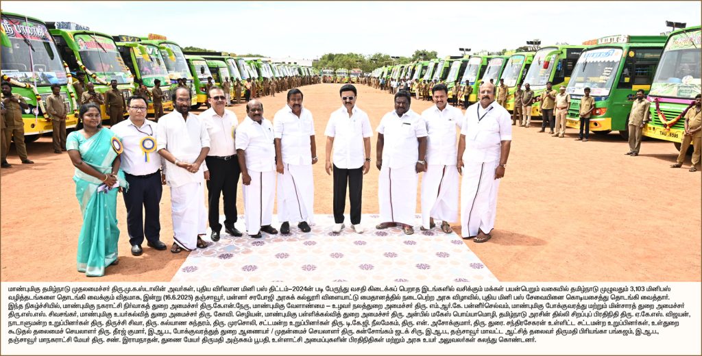 முதலமைச்சர் மு.க.ஸ்டாலின் அவர்கள் சேந்நு  (16.6.2025) தஞ்சாவூர், மன்னர் சரபோஜி அரசுக் கல்லூரி விளையாட்டு மைதானத்தில் நடைபெற்ற அரசு விழாவில், புதிய விரிவான மினி பஸ் திட்டம்-2024ன் படி பேருந்து வசதி கிடைக்கப் பெறாத இடங்களில் வசிக்கும் மக்கள் பயன்பெறும் வகையில் புதிய மினி பஸ் சேவையினை கொடியசைத்து தொடங்கி வைத்தார்.