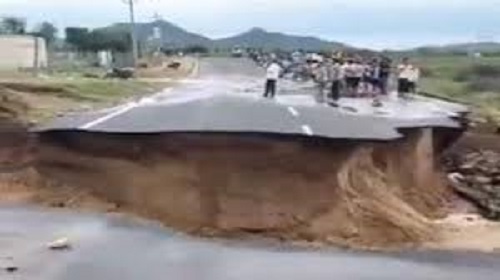 கன்மழை மற்றும் வெள்ளத்தால் புதிதாக அமைக்கப்பட்ட சாலை அடித்துச் செல்லப்பட்டது. இதனால் சுமார் 30 முதல் 35 அடி ஆழம் கொண்ட பள்ளம் உருவாகியுள்ளதை அப்பகுதி மக்கள் தங்களது செல்போனில் வீடியோ எடுத்து இணையத்தில் பதிவிட்டனர்.