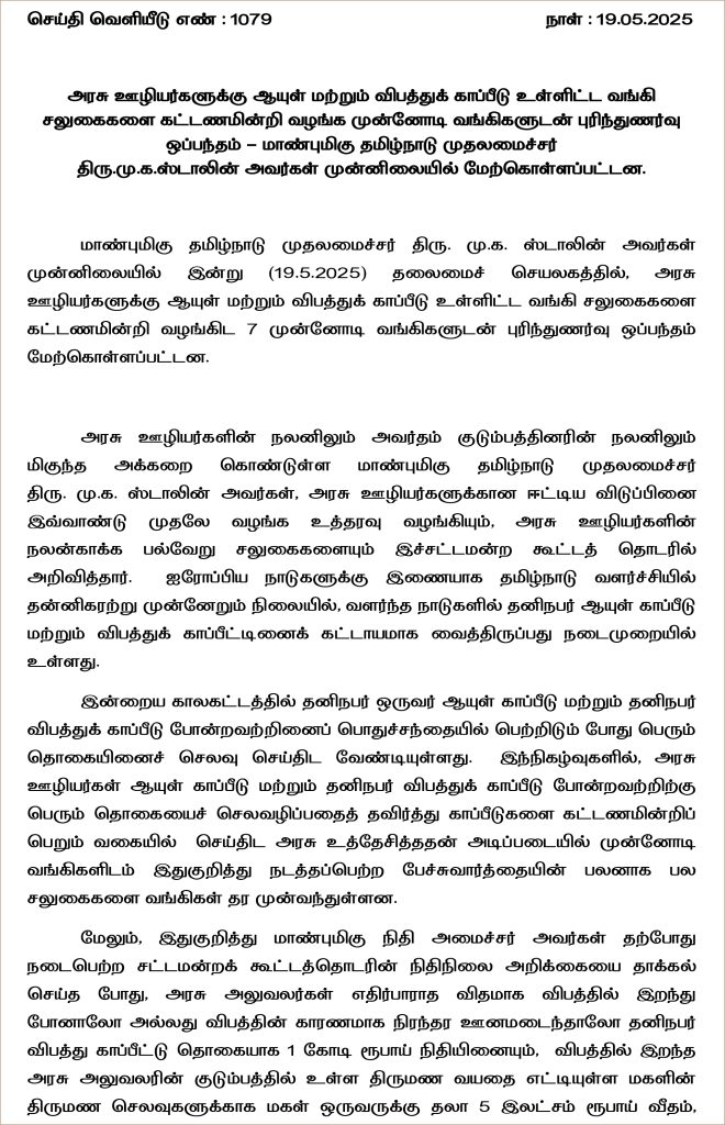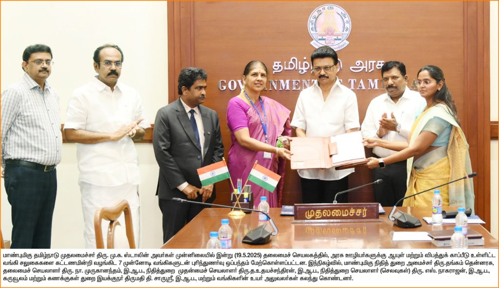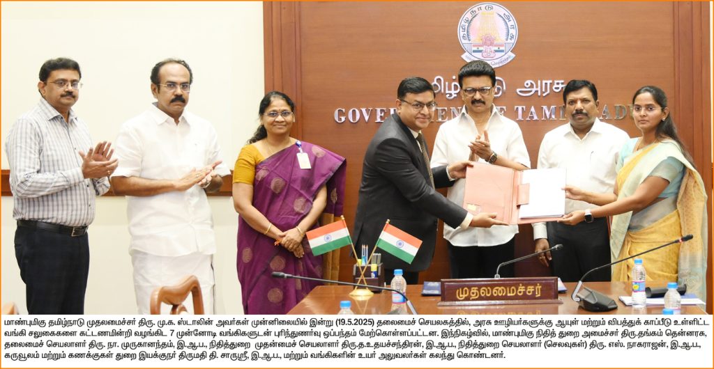 அதாவது, அரசு ஊழியர்களுக்கு ஆயுள் (ம) விபத்துக் காப்பீடு உள்ளிட்ட வங்கி சலுகைகளை கட்டணமின்றி வழங்க முன்னோடி வங்கிகளுடன் புரிந்துணர்வு ஒப்பந்தம்  தமிழ்நாடு முதலமைச்சர் மு.க.ஸ்டாலின்  முன்னிலையில் மேற்கொள்ளப்பட்டன