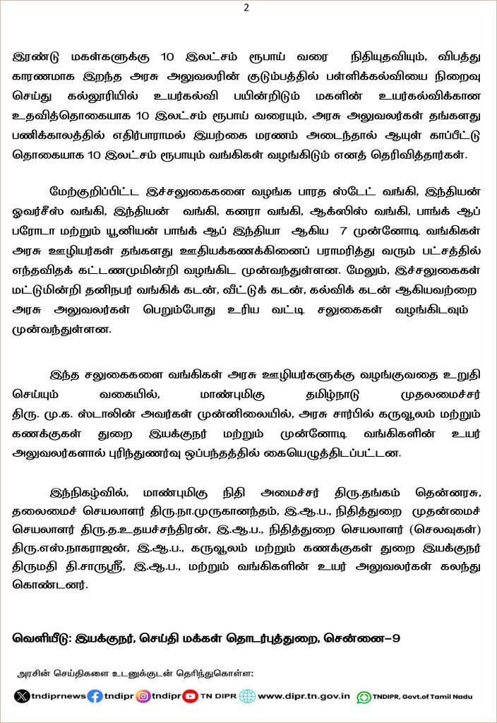 மேலும், இதுகுறித்து நிதி அமைச்சர் தங்கம் தென்னரசு  தற்போது நடைபெற்ற சட்டமன்றக் கூட்டத்தொடரின் நிதிநிலை அறிக்கையை தாக்கல் செய்த போது, அரசு அலுவலர்கள் எதிர்பாராத விதமாக விபத்தில் இறந்து போனாலோ அல்லது விபத்தின் காரணமாக நிரந்தர ஊனமடைந்தாலோ தனிநபர் விபத்து காப்பீட்டு தொகையாக 1 கோடி ரூபாய் நிதியினையும், விபத்தில் இறந்த அரசு அலுவலரின் குடும்பத்தில் உள்ள திருமண வயதை எட்டியுள்ள மகளின் திருமண செலவுகளுக்காக மகள் ஒருவருக்கு தலா 5 இலட்சம் ரூபாய் வீதம், இரண்டு மகள்களுக்கு 10 இலட்சம் ரூபாய் வரை நிதியுதவியும், விபத்து காரணமாக இறந்த அரசு அலுவலரின் குடும்பத்தில் பள்ளிக்கல்வியை நிறைவு செய்து கல்லூரியில் உயர்கல்வி பயின்றிடும் மகளின் உயர்கல்விக்கான உதவித்தொகையாக 10 இலட்சம் ரூபாய் வரையும், அரசு அலுவலர்கள் தங்களது பணிக்காலத்தில் எதிர்பாராமல் இயற்கை மரணம் அடைந்தால் ஆயுள் காப்பீட்டு தொகையாக 10 இலட்சம் ரூபாயும் வங்கிகள் வழங்கிடும் எனத் தெரிவித்தார்கள்.