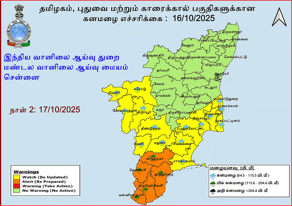 தமிழ்நாட்டில் அக்டோபர் 16, 17 தேதிகளில் 12 செ.மீ முதல் 20 செ.மீ வரை மிக கனமழைக்கு வாய்ப்பு உள்ளதால் இந்திய வானிலை ஆய்வு மையம் ஆரஞ்சு எச்சரிக்கை விடுத்துள்ளது. தமிழ்நாடு, புதுச்சேரி மற்றும் காரைக்கால் பகுதிகளில் இன்று முதல் 7 நாட்களுக்கு மிதமான மழைக்கு வாய்ப்பு எனவும் கணித்துள்ளது.