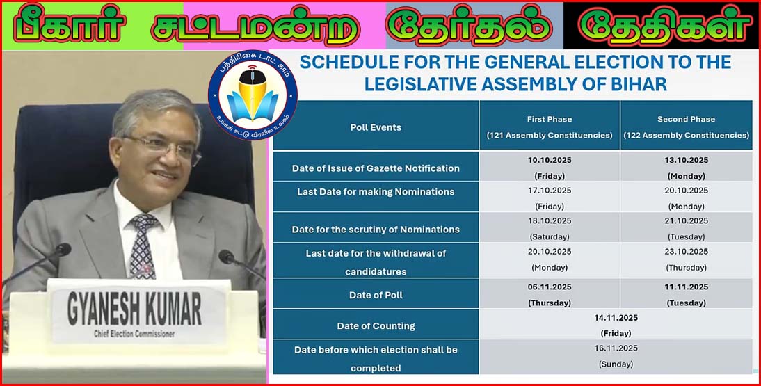 243 சட்டமன்ற தொகுதிகளைக் கொண்ட பீகார் மாநிலத்தின் தற்போதைய சட்டப்பேரவை ஆயுட்காலம் நவம்பர் 22 ஆம் தேதியுடன் நிறைவடைகிறது. இதையடுத்து மாநிலத்தில் இரண்டு கட்டங்களாக சட்டமன்ற தேர்தல் தேதிகள் அறிவிக்கப்பட்டு உள்ளது. அதன்படி, நவம்பர் 6, 11 – இரண்டு கட்டங்களாக வாக்குப்பதிவு நடைபெறும் இந்திய தலைமைத் தேர்தல் ஆணையர் ஞானேஷ் குமார் அறிவித்துள்ளார்.