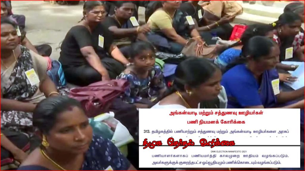 தமிழ்நாடு அரசுப் பள்ளிகளில் பணிபுரியும் சத்துணவுப் பணியாளர்கள் தங்களை காலமுறை ஊதியத்திற்கு மாற்ற வேண்டும், உரிய ஓய்வூதியம் வழங்க வேண்டும் உள்ளிட்ட கோரிக்கைகளை வலியுறுத்தி பல ஆண்டுகளாகத் தொடர் போராட்டங்களை நடத்தி வருகின்றனர். 2021ல்திமுக அரசு ஆட்சிக்கு வருவதற்கு முன்பாக வெளியிட்ட தேர்தல் அறிக்கையில், சத்துணவு ஊழியர்களுக்கு காலமுறை ஊதியம் வழங்கப்படும் என்று தேர்தல் அறிக்கையில் (எண்: 313) வாக்குறுதியளித்த நிலையில், இதுவரை அதை நிறைவேற்றாமல் இழுத்தடித்து வருகிறது.