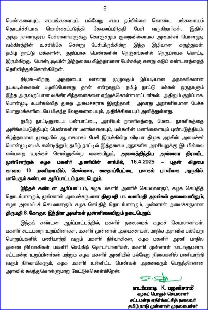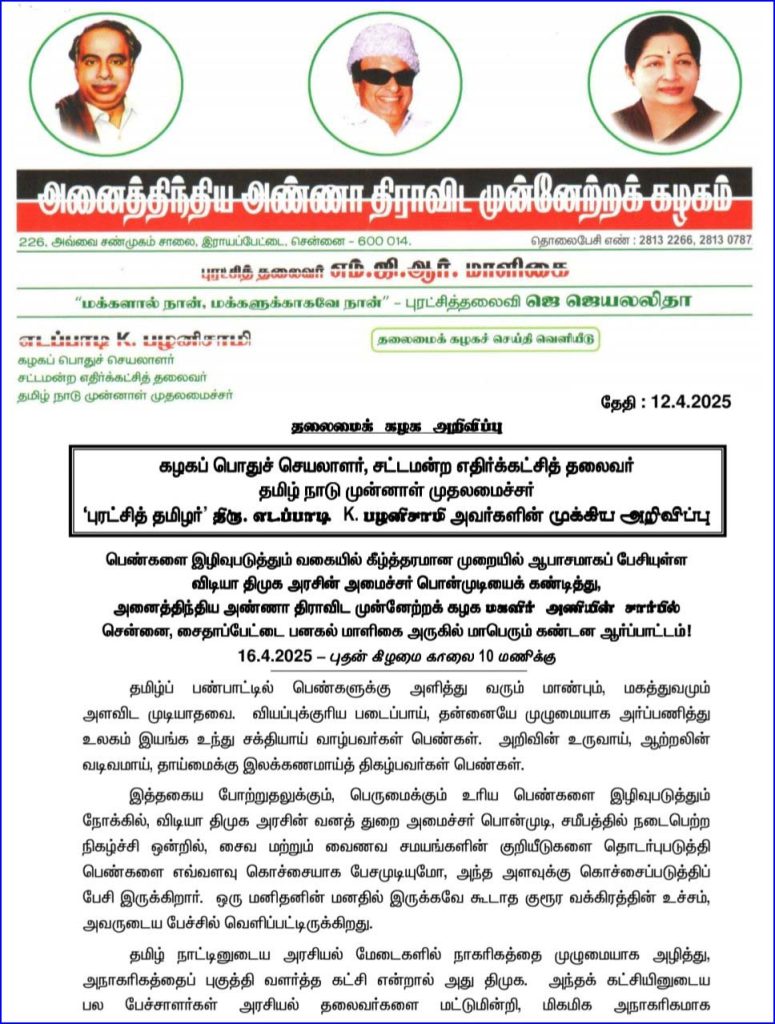 பெண்களை இழிவுபடுத்தும் வகையில் கீழ்த்தரமான முறையில் ஆபாசமாகப் பேசியுள்ள விடியா திமுக அரசின் அமைச்சர் பொன்முடியைக் கண்டித்து, அனைத்திந்திய அண்ணா திராவிட முன்னேற்றக் கழக மகளிர் அணியின் சார்பில் சென்னை, சைதாப்பேட்டை பனகல் மாளிகை அருகில் மாபெரும் கண்டன ஆர்ப்பாட்டம் ! 16.4.2025 – புதன் கிழமை காலை 10 மணிக்கு.