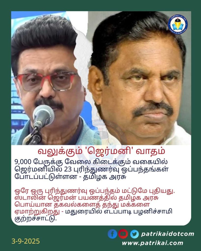 இந்த நிலையில், மதுரையில் ஜெர்மனியில் முதல்வர் ஸ்டாலின் முன்னிலையில், போடப்பட்ட ஒப்பந்தத்தில் ஒரே ஒரு ஒப்பந்தம் மட்டுமே புதியது மற்ற அனைத்தும் ஏற்கனவே நடைமுறையில் உள்ளது எதிர்க்கட்சி தலைவரும் முன்னாள் முதல்வருமான எடப்பாடி பழனிச்சாமி குற்றம் சாட்டி உள்ளார்.