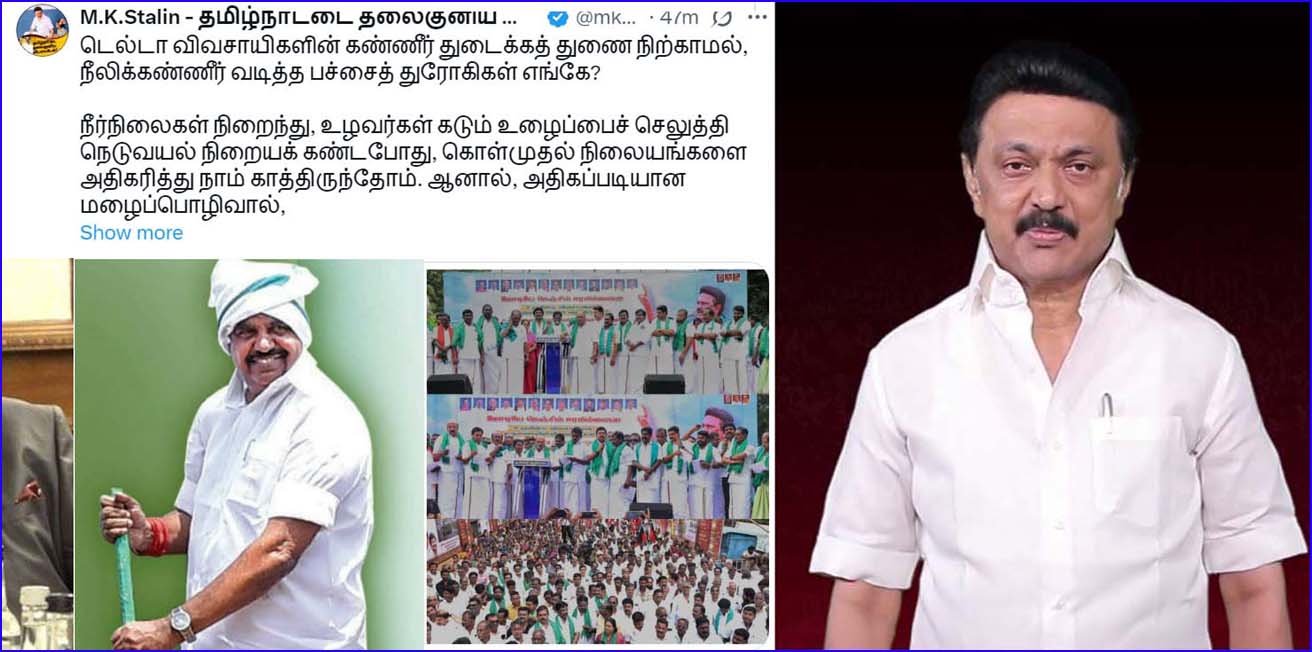 டெல்டா விவசாயிகளின் கண்ணீர் துடைக்கத் துணை நிற்காமல், நீலிக்கண்ணீர் வடித்த பச்சைத் துரோகிகள் எங்கே?நீர்நிலைகள் நிறைந்து, உழவர்கள் கடும் உழைப்பைச் செலுத்தி நெடுவயல் நிறையக் கண்டபோது, கொள்முதல் நிலையங்களை அதிகரித்து நாம் காத்திருந்தோம். ஆனால், அதிகப்படியான மழைப்பொழிவால், நெல்மணிகள் ஈரமாயின. உடனே, “சாகுபடிக் காலத்திற்கு முன்னதாகவே ஏன் அறுவடை செய்யவில்லை?” என்றெல்லாம் அதிமேதாவித்தன அரசியல் செய்தார், பச்சைத்துண்டு போட்டு பச்சைத் துரோகம் செய்தவரான மாண்புமிகு எதிர்க்கட்சித் தலைவர் பழனிசாமி .