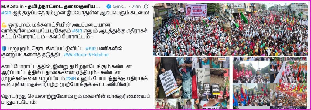 தமிழ்நாடு முழுவதும் வாக்காளர் பட்டியல் சீர்திருத்தப் பணிகள் தொடங்கி நடைபெற்று வருகிறது. இதற்கு எதிர்ப்பு தெரிவித்து வரும் திமுக, காங்கிரஸ் மற்றும் கூட்டணி கட்சிகள் சார்பில், இன்று  மாநிலம் முழுவதும் ஆர்ப்பாட்டம் நடைபெற்றது. இந்த ஆர்ப்பாட்டத்தை சுட்டிக்காட்டி, முதலமைச்சர் ஸ்டாலின்,  நம்முன் இப்போதுள்ள ஆகப்பெரும் கடமை ‘SIR-ஐத் தடுப்பதே என குறிப்பிட்டுள்ளார.