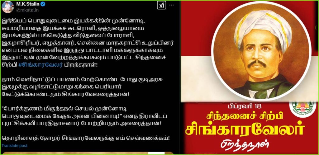 சென்னை: தொழிலாளத் தோழர் சிங்காரவேலருக்கு எம் செவ்வணக்கம் என சிங்காரவேலர் பிறந்தநாளை முன்னிட்டு முதலமைச்சர் ஸ்டாலின் புகழாரம் சூட்டி உள்ளார்.