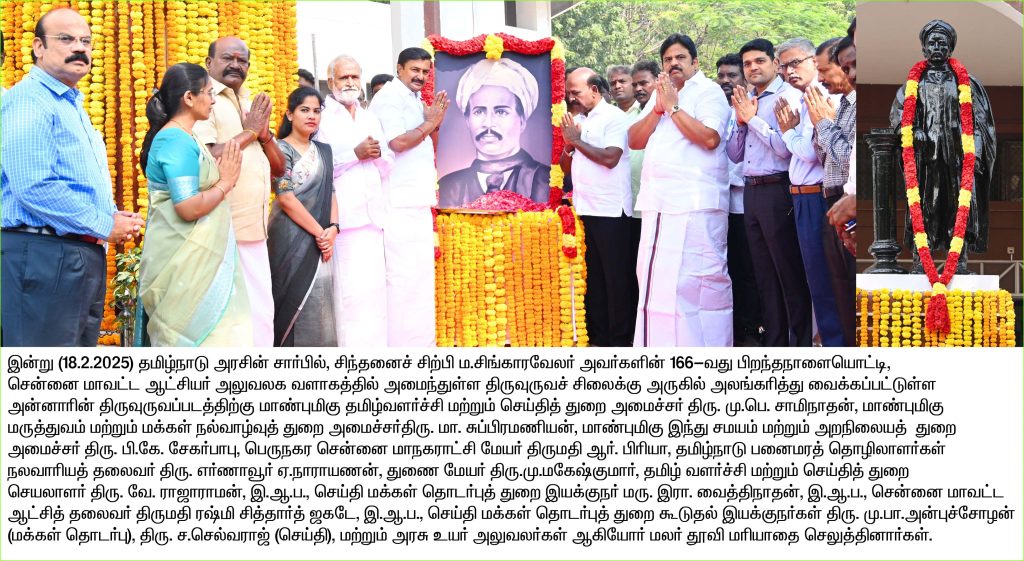 ஒத்துழையாமை இயக்கத்தில் பங்கெடுத்த விடுதலைப் போராளி,. சிந்தனைச் சிற்பி ம.சிங்காரவேலர் அவர்களின் 166-வது பிறந்தநாளையொட்டி, அன்னாரின் திருவுருவப்படத்திற்கு கு அமைச்சர் பெருமக்கள் மலர் தூவி மரியாதை செலுத்தினார்கள்.