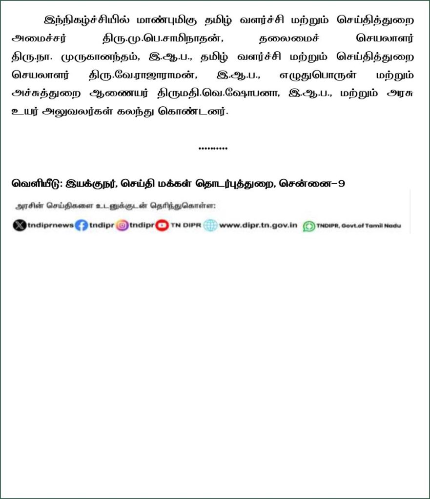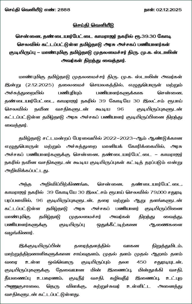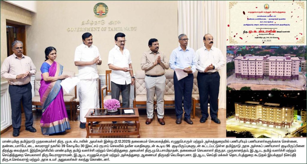இதைத்தொடர்ந்து, , தண்டையார்பேட்டை காமராஜர் நகரில் ரூ.39.30 கோடி செலவில் கட்டப்பட்டுள்ள தமிழ்நாடு அரசு அச்சகப் பணியாளர்கள் குடியிருப்பு – மாண்புமிகு தமிழ்நாடு முதலமைச்சர் ஸ்டாலின் திறந்து வைத்தார்.