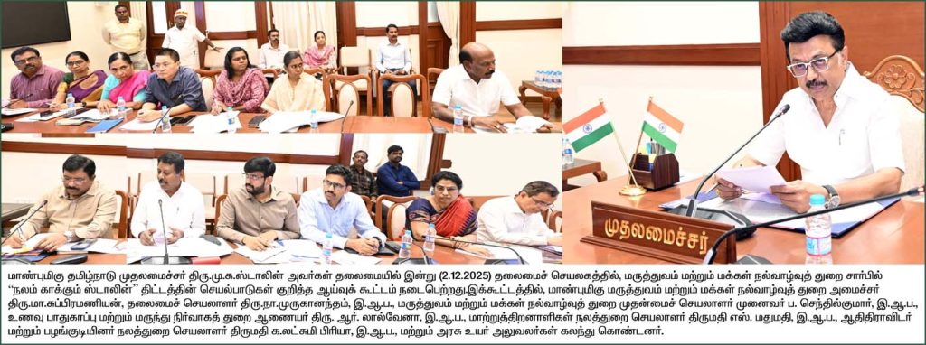 சென்னை : “நலம் காக்கும் ஸ்டாலின்” முகாம்கள் குறித்து மக்களுக்கு விழிப்புணர்வு ஏற்படுத்திட வேண்டும் என கோட்டையில் நடைபெற்ற ஆய்வு கூட்டத்தில் பேசிய முதலமைச்சர் மு.க.ஸ்டாலின் அறிவுறுத்தினார்.