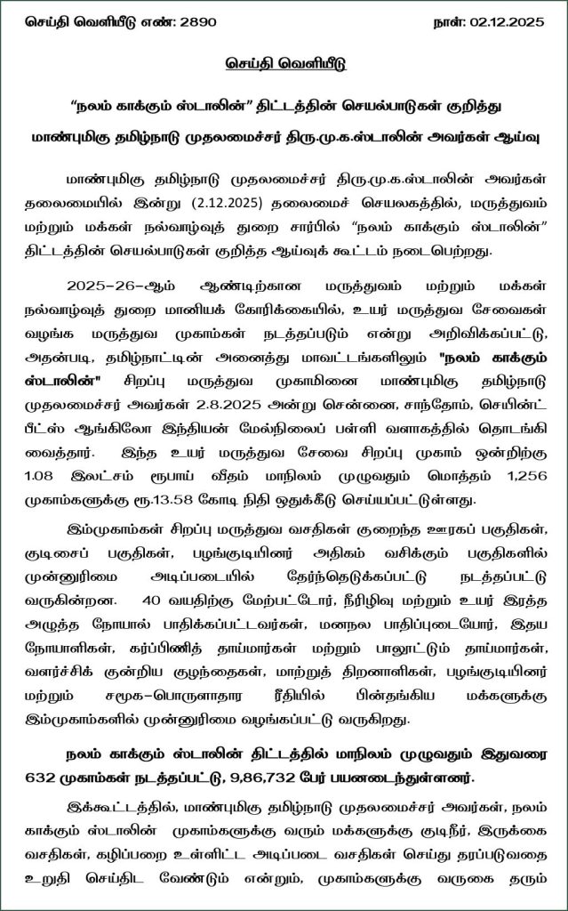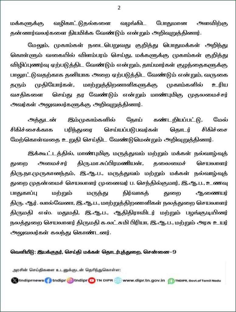இந்த ஆய்வு கூட்டத்தில் பேசிய முதலமைச்சர் மு.க.ஸ்டாலின் , “நலம் காக்கும் ஸ்டாலின்” முகாம்களுக்கு வரும் மக்களுக்கு அடிப்படை வசதிகள் செய்து தரப்படுவதை உறுதி செய்திட வேண்டும், “நலம் காக்கும் ஸ்டாலின்” முகாம்களுக்கு வருகை தரும் மக்களுக்கு வழிகாட்டுதல்களை வழங்கிட போதுமான தன்னார்வலர்களை நியமிக்க வேண்டும், முகாம்கள் நடைபெறுவது குறித்து பொதுமக்கள் அறிந்து கொள்ளும் வகையில் விளம்பரம் செய்து, மக்களுக்கு முகாம்கள் குறித்து விழிப்புணர்வு ஏற்படுத்திட வேண்டும்,” என அறிவுறுத்தினார்.